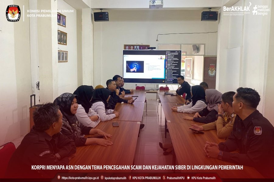 #Temanpemilih, Pada Hari Rabu, Tanggal 21 Januari 2026 Pukul 08.30 WIB-Selesai. Bertempat di Ruang Aula KPU Kota Prabumulih. Jajaran Sekretariat KPU Kota Prabumulih mengikuti Kegiatan “KORPRI MENYAPA ASN” dengan Tema: “Pencegahan Scam dan Kejahatan Siber di Lingkungan Pemerintah”. #KPUMelayani Find Us On : Facebook : KPU KOTA PRABUMULIH Instagram : kpukotaprabumulih Tiktok : KPU Kota Prabumulih Youtube : KPU KOTA PRABUMULIH Twitter : PrabumulihKpu Website : https://kota-prabumulih.kpu.go.id/ Alamat : Jl. Jend. A. Yani No.09, Prabu Jaya, Prabumulih Timur ....