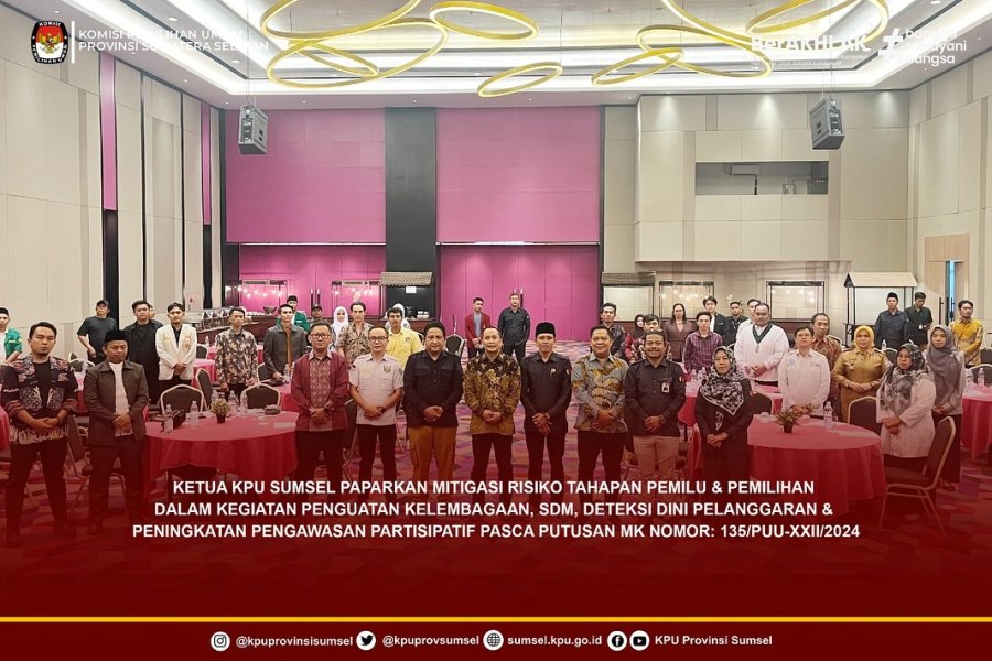 #Repost KPU Provinsi Sumatera Selatan #Temanpemilih Ketua KPU Sumsel, Bapak Andika Pranata Jaya sampaikan Mitigasi Risiko Tahapan Pemilu dan Pemilihan dalam kegiatan penguatan kelembagaan, SDM, deteksi dini pelanggaran dan peningkatan pengawasan partisipatif pasca putusan Mahkamah Konstitusi Nimor: 135/PUU-XXII/2024 Bawaslu Kabupaten Ogan Komering Ulu Selatan di Hotel The Zuri Baturaja, Jum'at (29/8/2025).