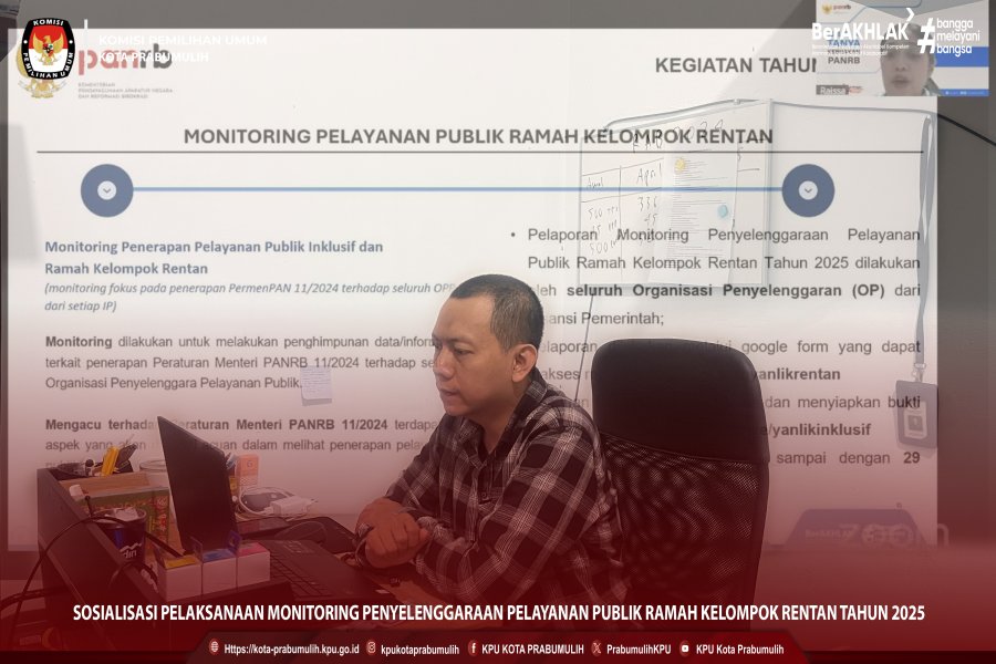 #TemanPemilih, Pada hari Kamis, Tanggal 11 September 2025, Pukul 08.30 WIB - Selesai, Kasubbag Perencanaan, Data Dan Informasi Bpk Abdul Aziz mengikuti Kegiatan Sosialisasi Pelaksanaan Monitoring Penyelenggaraan Pelayanan Publik Ramah Kelompok Rentan Tahun 2025, Kegiatan ini diselenggarakan oleh Komisi Pemilihan Umum Republik Indonesia secara daring melalui Aplikasi Zoom.