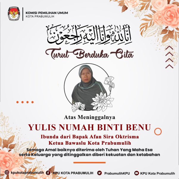 #TemanPemilih, keluarga besar KPU Kota Prabumulih mengucapkan duka mendalam atas meninggalnya Yulis Numah Binti Benu, Ibunda dari Bapak Afan Sira Oktrisma Ketua Bawaslu Kota Prabumulih.