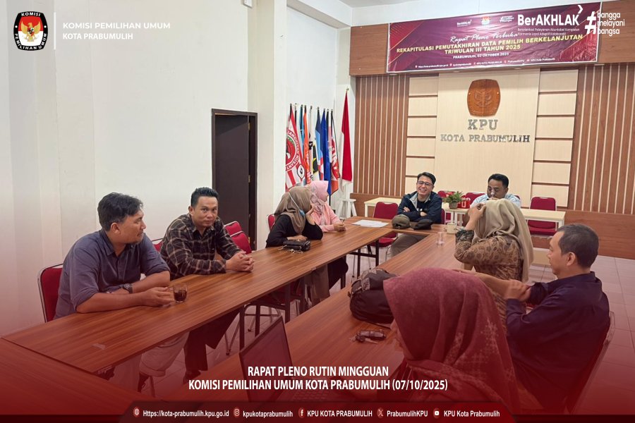 #TemanPemilih, Pada hari Selasa, tanggal 07 Oktober 2025, Pukul 15.30 WIB s.d selesai bertempat di Ruang Aula, Anggota KPU Kota Prabumulih, Kasubbag dan Pejabat Fungsional melaksanakan Kegiatan Rapat Pleno Rutin Mingguan KPU Kota Prabumulih.