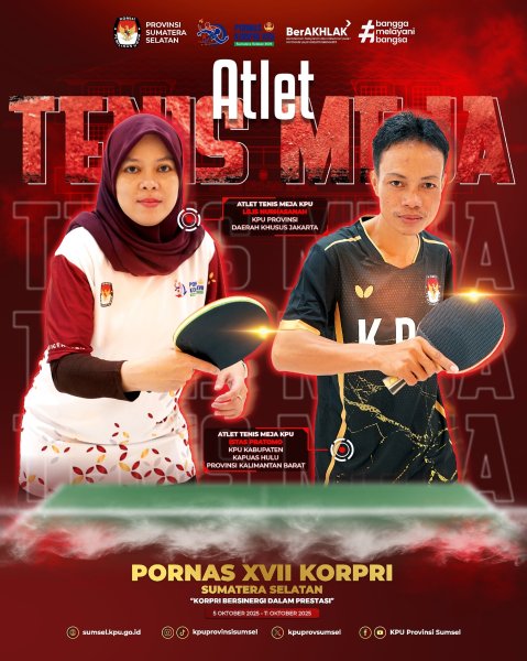 #Repost KPU Provinsi Sumatera Selatan #Temanpemilih Selamat bertanding kepada Kontingen Cabor Tenis Meja yang diwakili oleh KPU Provinsi Daerah Khusus Jakarta, Lilis Nurhasanah dan KPU Kabupaten Kapuas Hulu Provinsi Kalimantan Barat, Istas Pratomo dalam Pekan Olahraga Nasional (Pornas) KORPRI XVII Tahun 2025