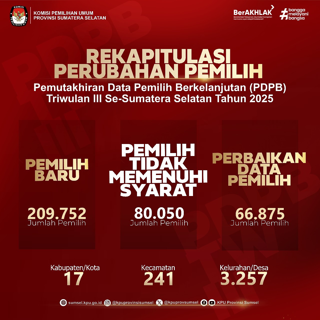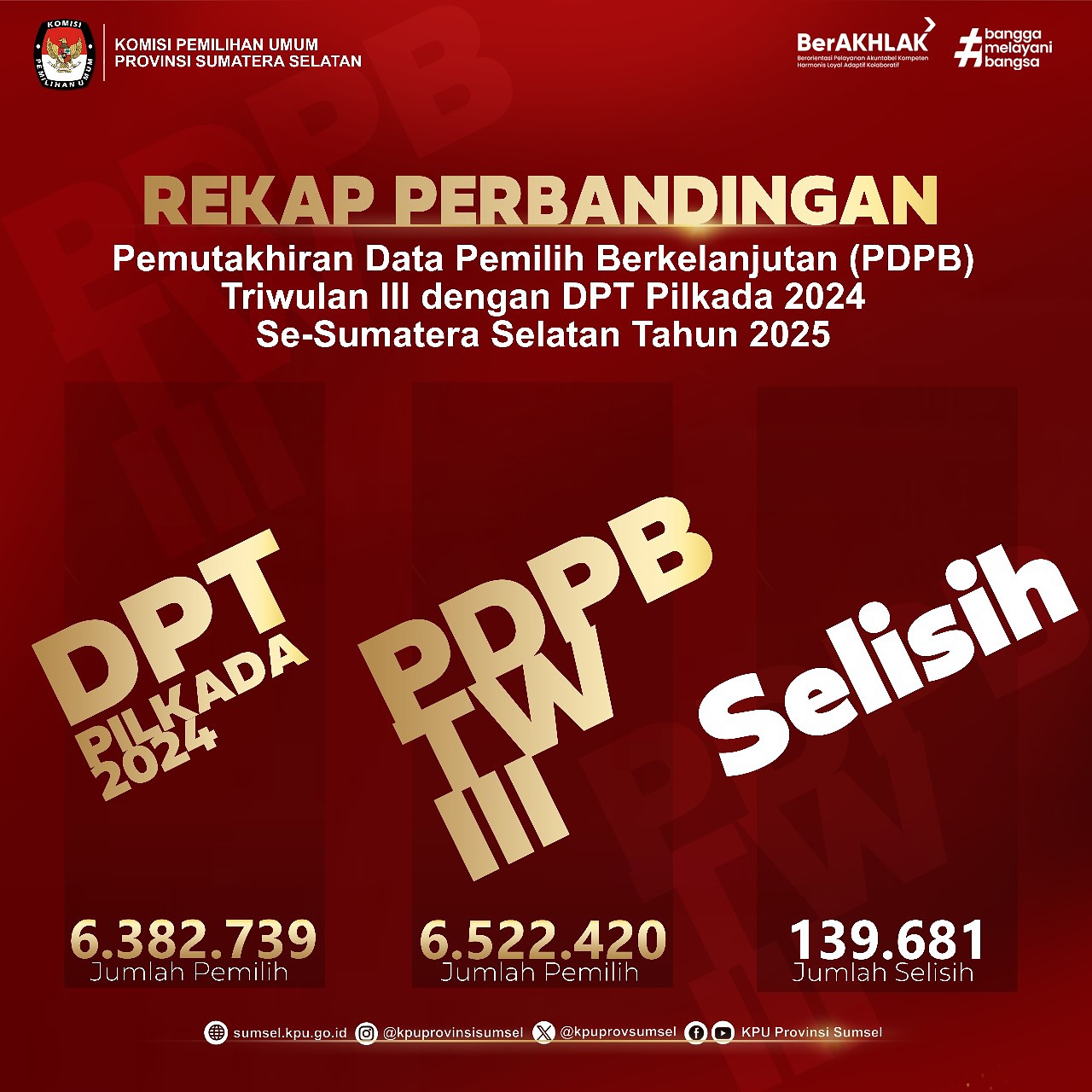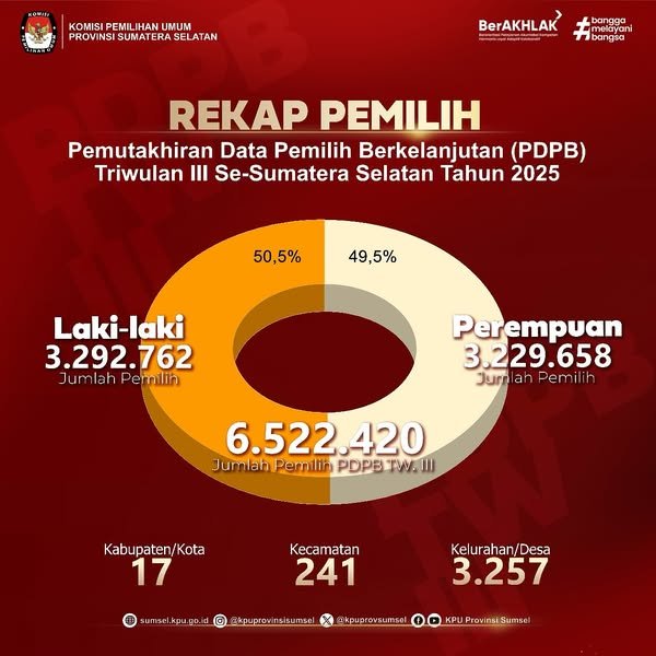 #Repost KPU Provinsi Sumatera Selatan #Temanpemilih berikut rekapitulasi Pemutakhiran Data Pemilih Berkelanjutan (PDPB) Triwulan III se-Sumatera Selatan tahun 2025 berdasarkan Berita Acara Rekapitulasi PDPB KPU Kabupaten/Kota se-Sumsel.