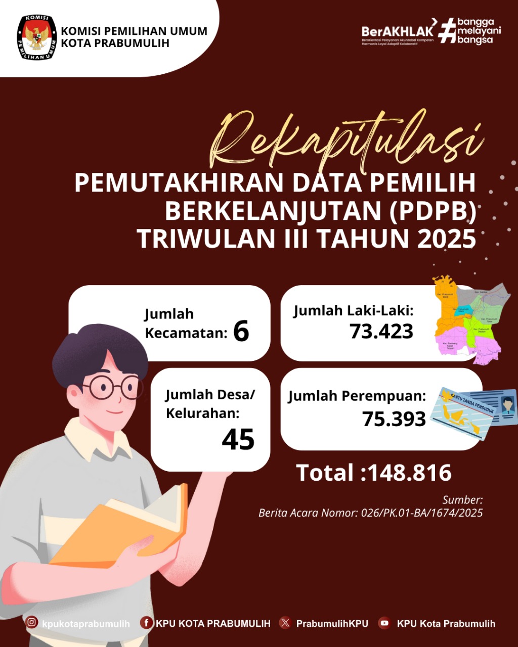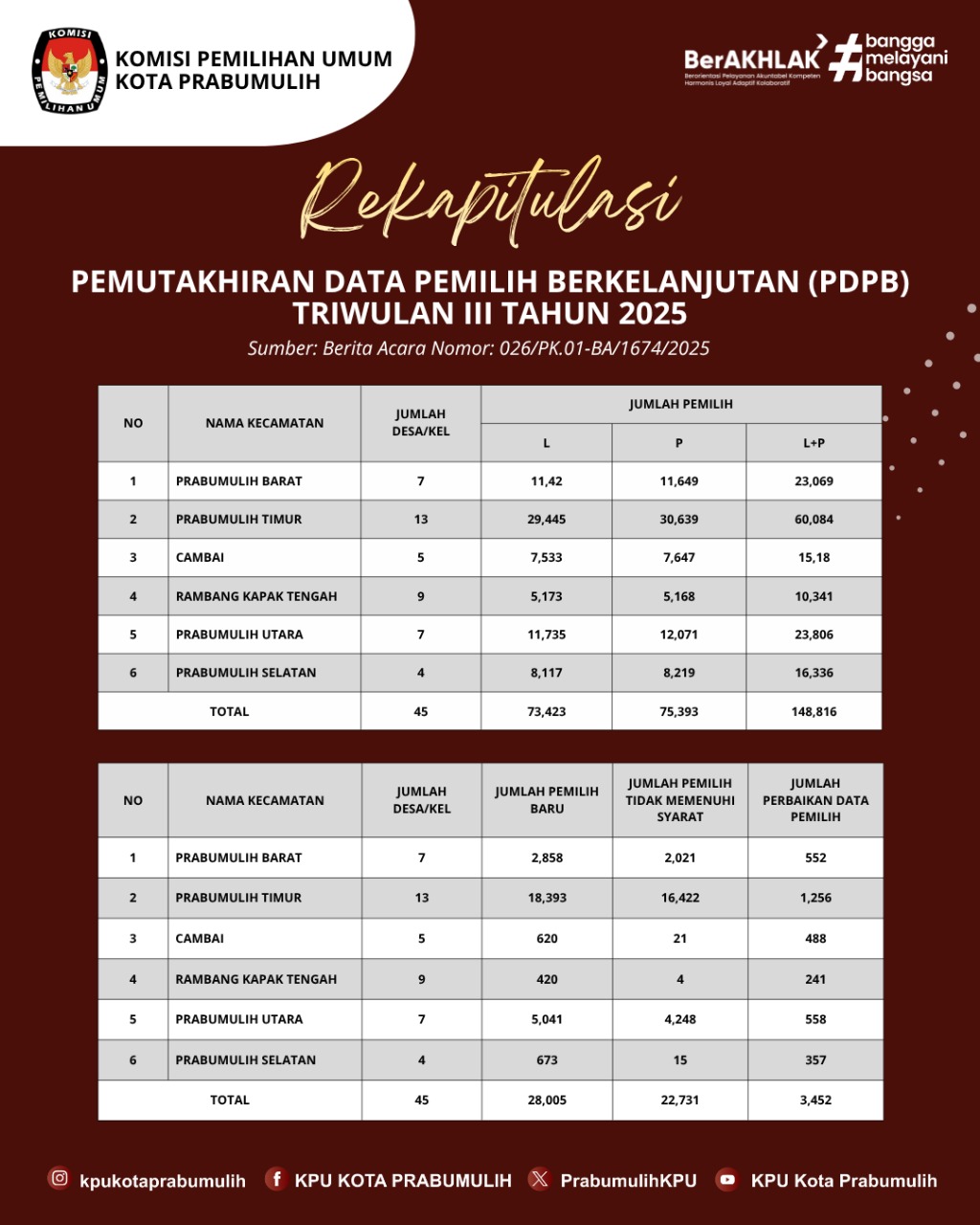#Temanpemilih, Berikut disampaikan Rekapitulasi Pemutakhiran Data Pemilih Berkelanjutan Triwulan III Tahun 2025 berdasarkan Berita Acara KPU Kota Prabumulih Nomor 026/PK.01-BA/1674/2025.