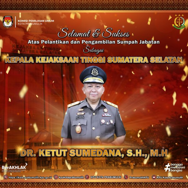 #Temanpemilih KPU Kota Prabumulih mengucapkan selamat dan sukses atas pelantikan dan pengambilan sumpah jabatan Bapak Dr. Ketut Sumedana, S.H., M.H sebagai Kepala Kejaksaan Tinngi Sumatera Selatan.
