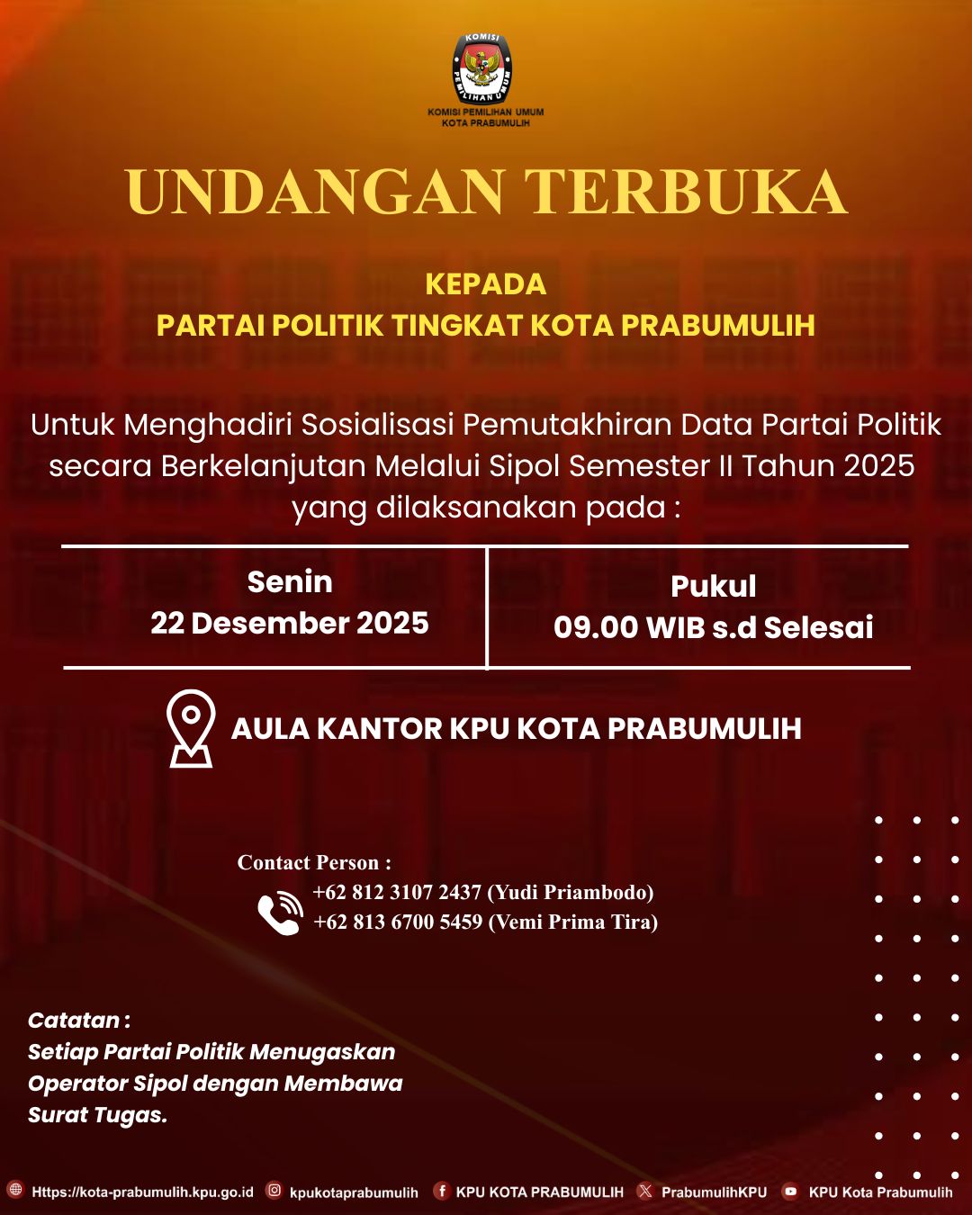 #Temanpemilih, KPU Kota Prabumulih Menyampaikan Undangan Terbuka Kepada Partai Politik Tingkat Kota Prabumulih Untuk Menghadiri Sosialisasi Pemutakhiran Data Partai Politik Berkelanjutan Melalui Sipol Semester II Tahun 2025.