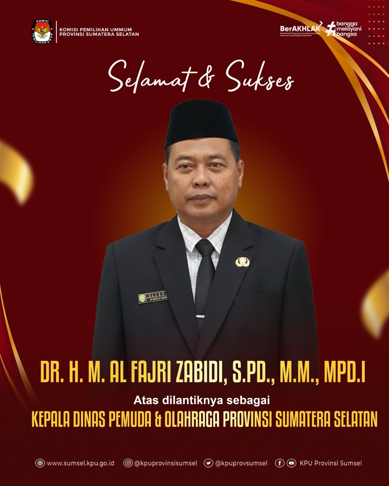 KPU Provinsi Sumatera Selatan mengucapkan selamat dan sukses kepada Bapak Drs. H. Arinarsa JS, atas dilantiknya sebagai Kepala Badan Kebangpol Provinsi Sumatera Selatan.