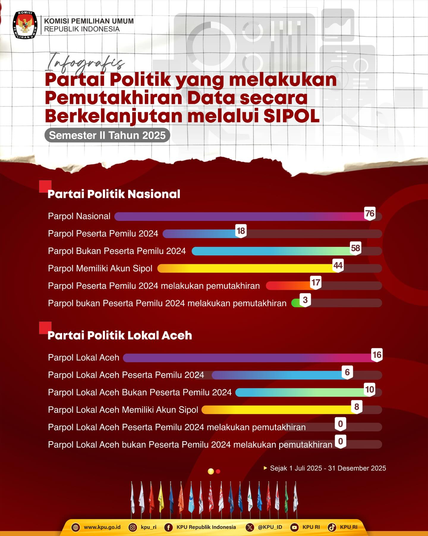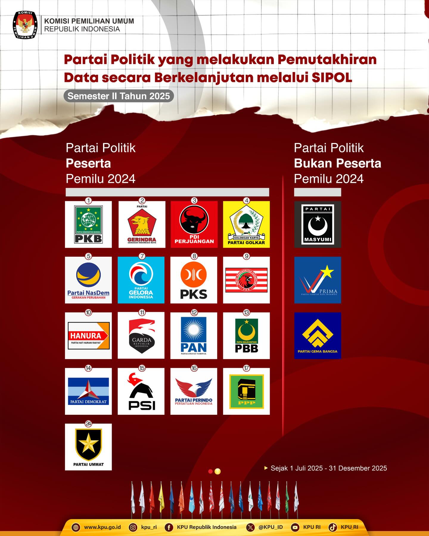 inilah daftar Partai Politik yang melakukan Pemutakhiran Data Secara Berkelanjutan melalui SIPOL Senin, 19 Januari 2026 00:00 22 #Repost KPU Republik Indonesia #TemanPemilih, inilah daftar Partai Politik yang melakukan Pemutakhiran Data Secara Berkelanjutan melalui SIPOL pada Semester II Tahun 2025. Simak selengkapnya di infografis ini ya. #KPUMelayani #PemiluSerentak2024 Bagikan: Telah dilihat 22 kali