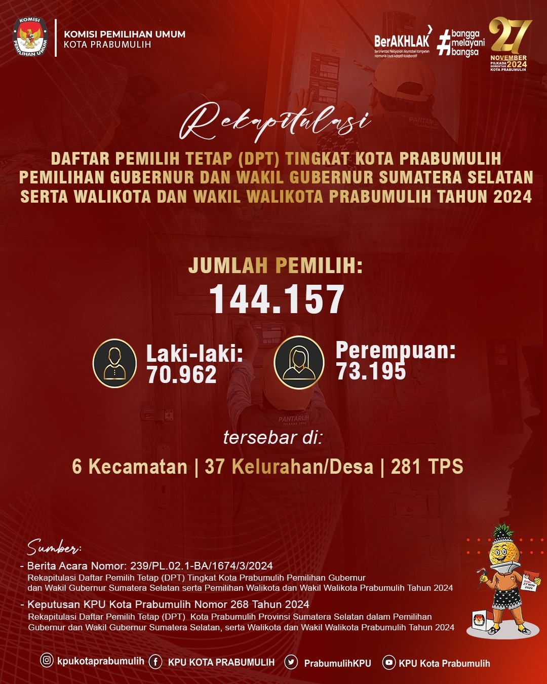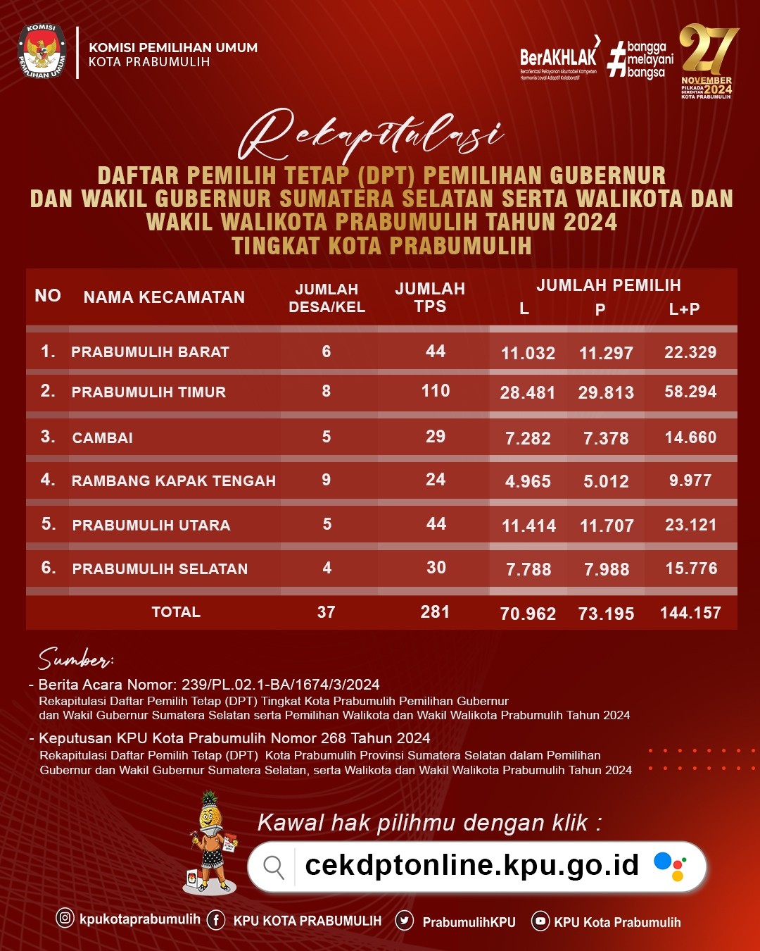 #TemanPemilih, Berikut kami sampaikan Berita acara dan Keputusan KPU Kota Prabumulih tentang Rekapitulasi Daftar pemilih tetap (DPT) tingkat Kota Prabumulih pemilihan gubernur dan wakil gubernur Sumatera Selatan serta Walikota dan Wakil Walikota Prabumulih tahun 2024.