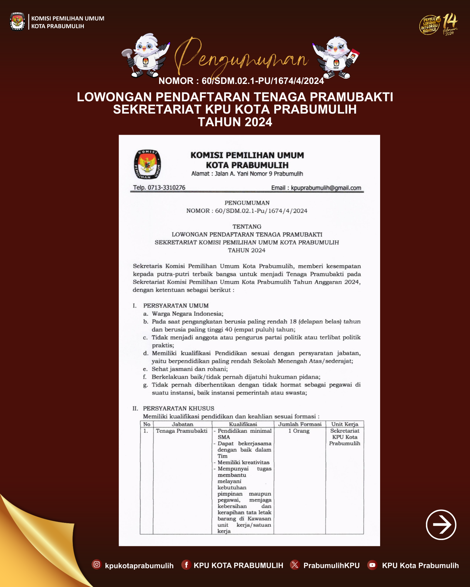 Nomor: 60/SDM.02.1-Pu/1674/4/2024 tentang Lowongan Pendaftaran Tenaga Pramubakti Sekretariat KPU Kota Prabumulih Tahun 2024.