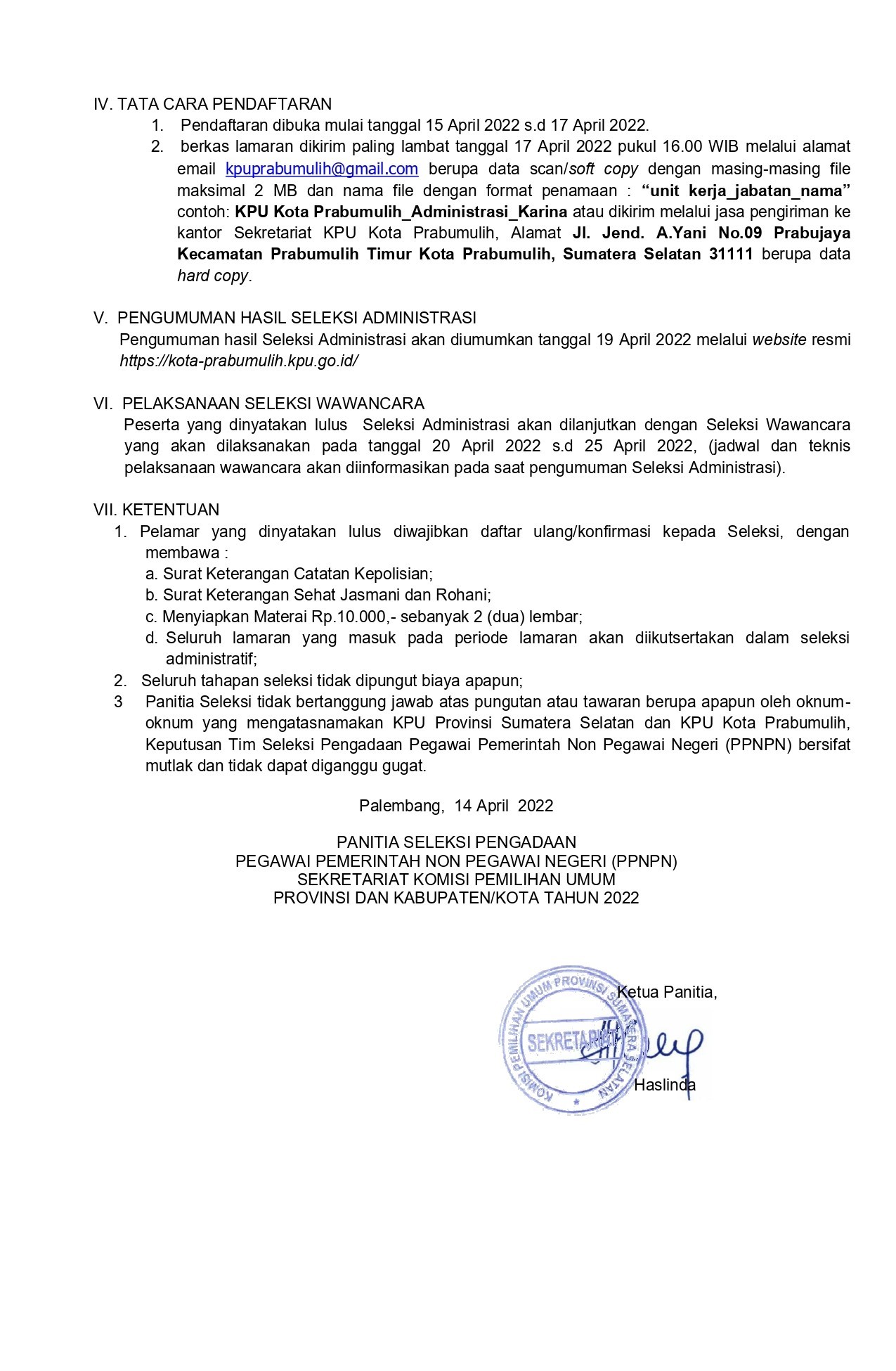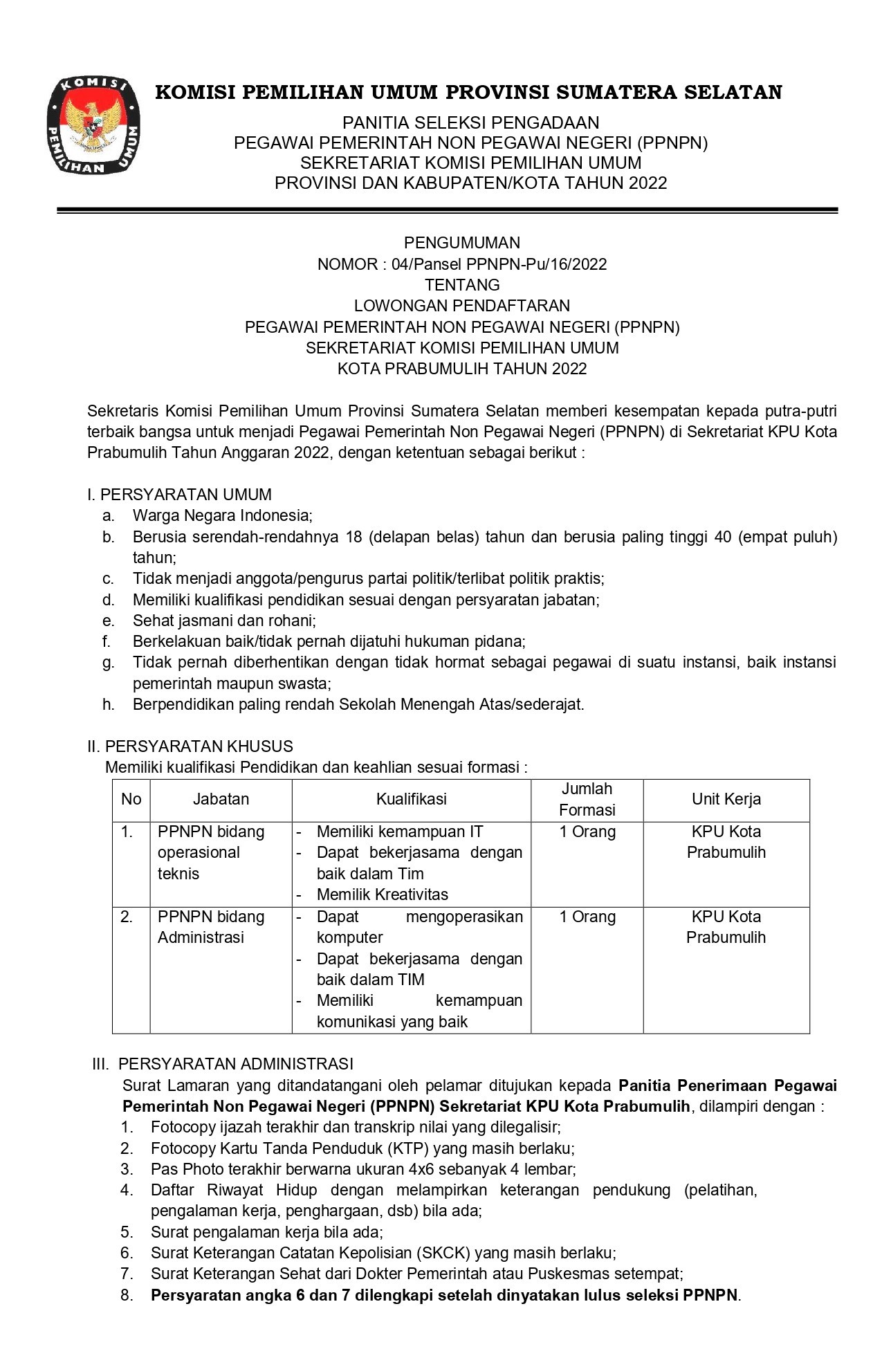 Sekretaris Komisi Pemilihan Umum Provinsi Sumatera Selatan memberi kesempatan kepada putra-putri terbaik bangsa untuk menjadi Pegawai Pemerintah Non Pegawai Negeri (PPNPN) di Sekretariat KPU Kota Prabumulih Tahun Anggaran 2022. Untuk lebih detailnya bisa dilihat di bawah ini :