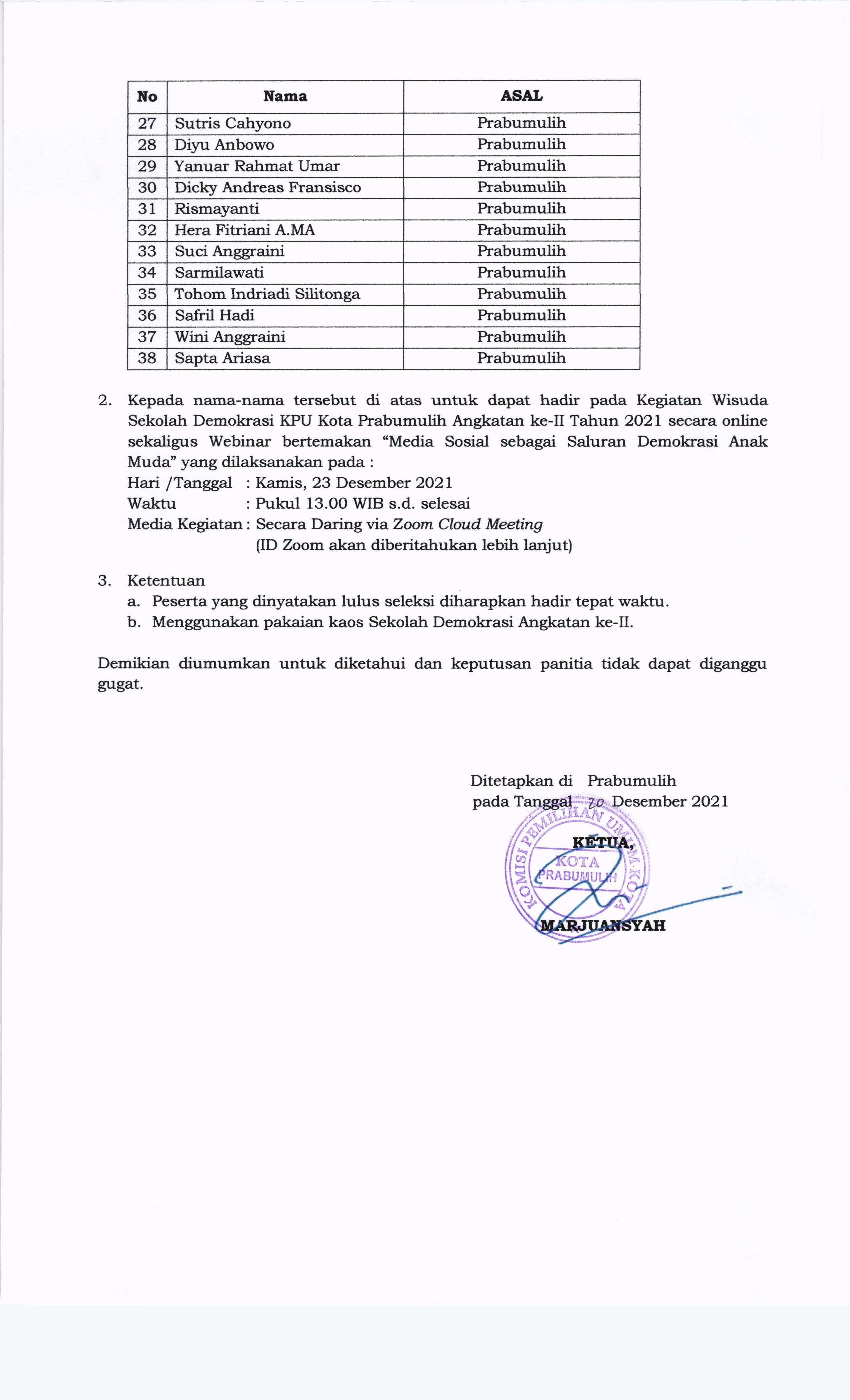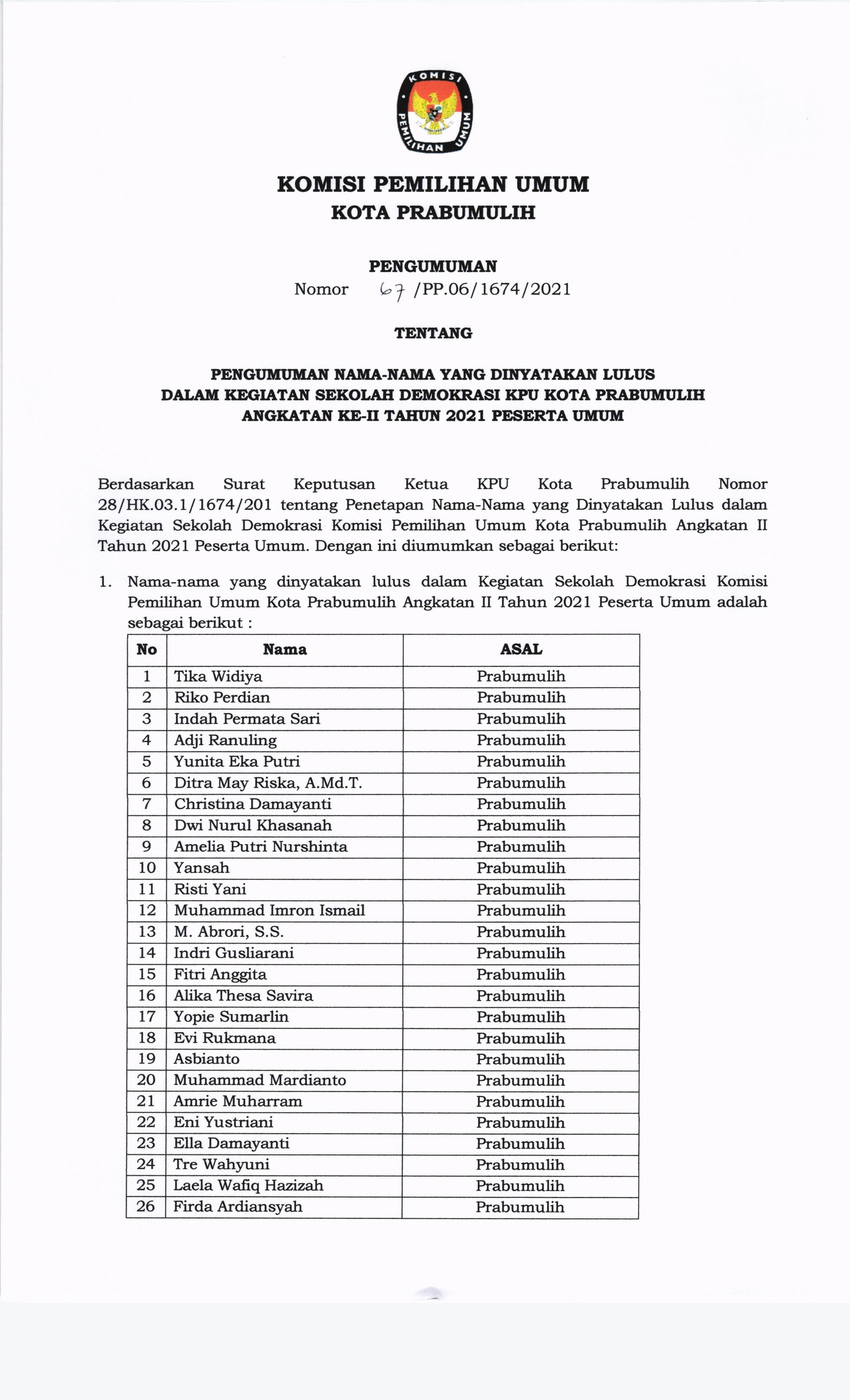 Berdasarkan Surat Keputusan Ketua KPU Kota Prabumulih Nomor 28/HK.03.1/1674/201 tentang Penetapan nama nama yang dinyatakan lulus dalam kegiatan Sekolah Demokrasi KPU Kota Prabumulih angkatan II Tahun 2021 untuk Peserta Umum. Bisa didownload disini