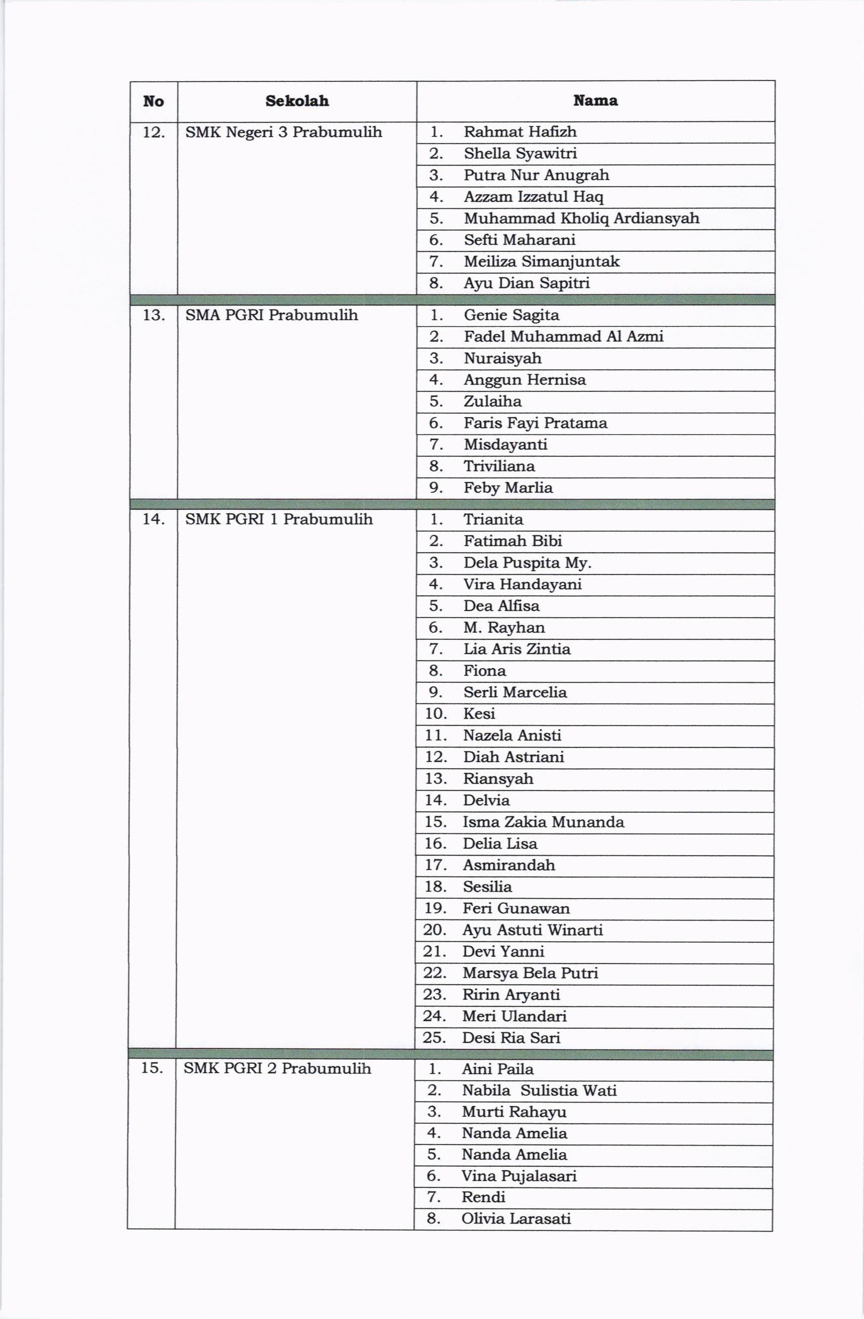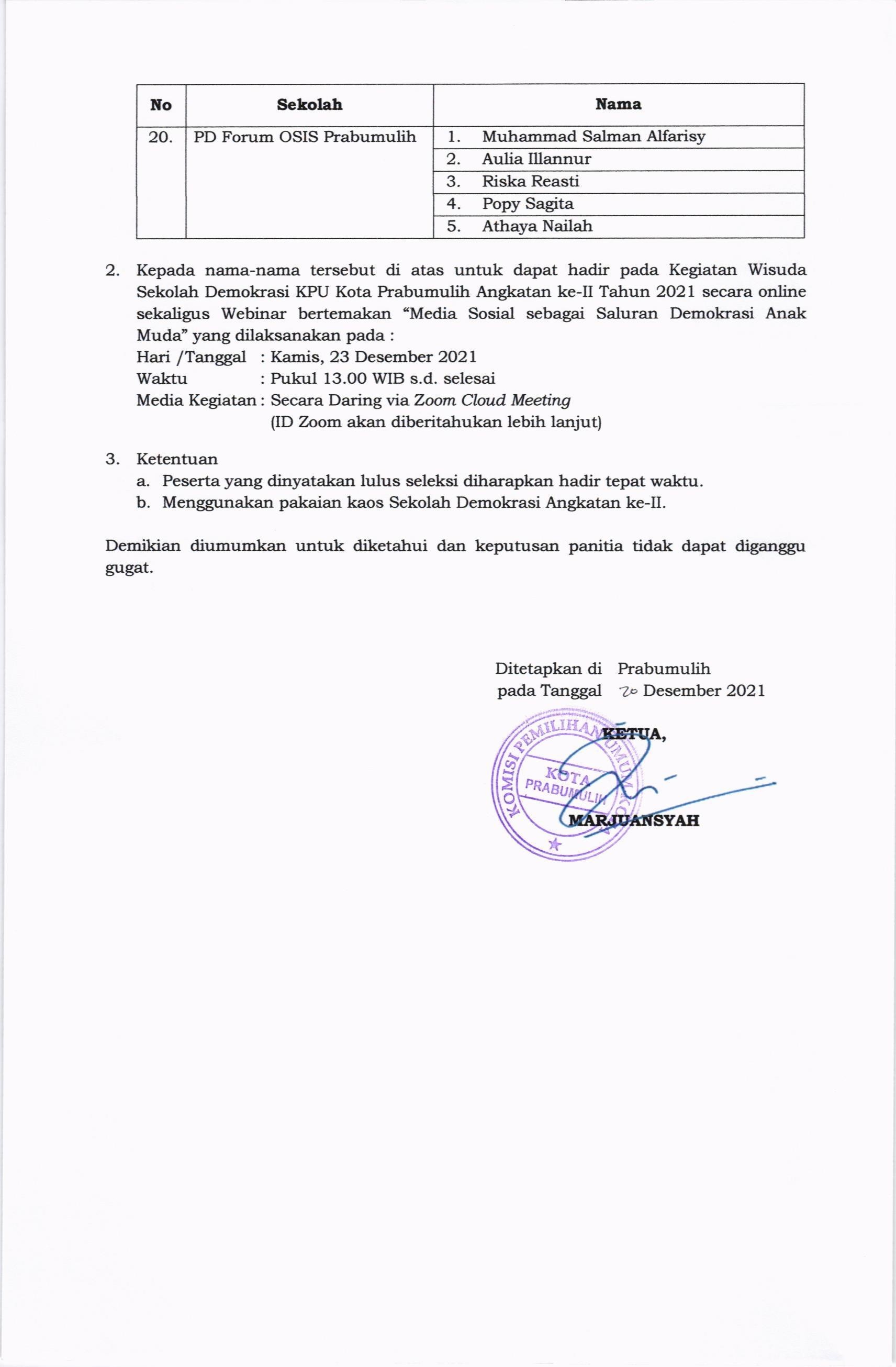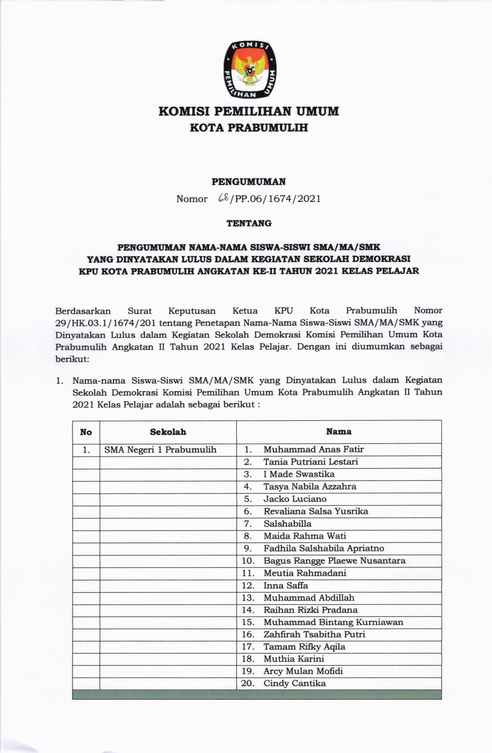 Berdasarkan Surat Keputusan Ketua KPU Kota Prabumulih Nomor 29/HK.03.1/1674/201 tentang Penetapan nama nama Siswa siswi SMA/MA/SMK yang Dinyatakan lulus dalam kegiatan Sekolah Demokrasi KPU Kota Prabumulih angkatan II Tahun 2021 untuk Kelas Pelajar. Bisa didownload disini