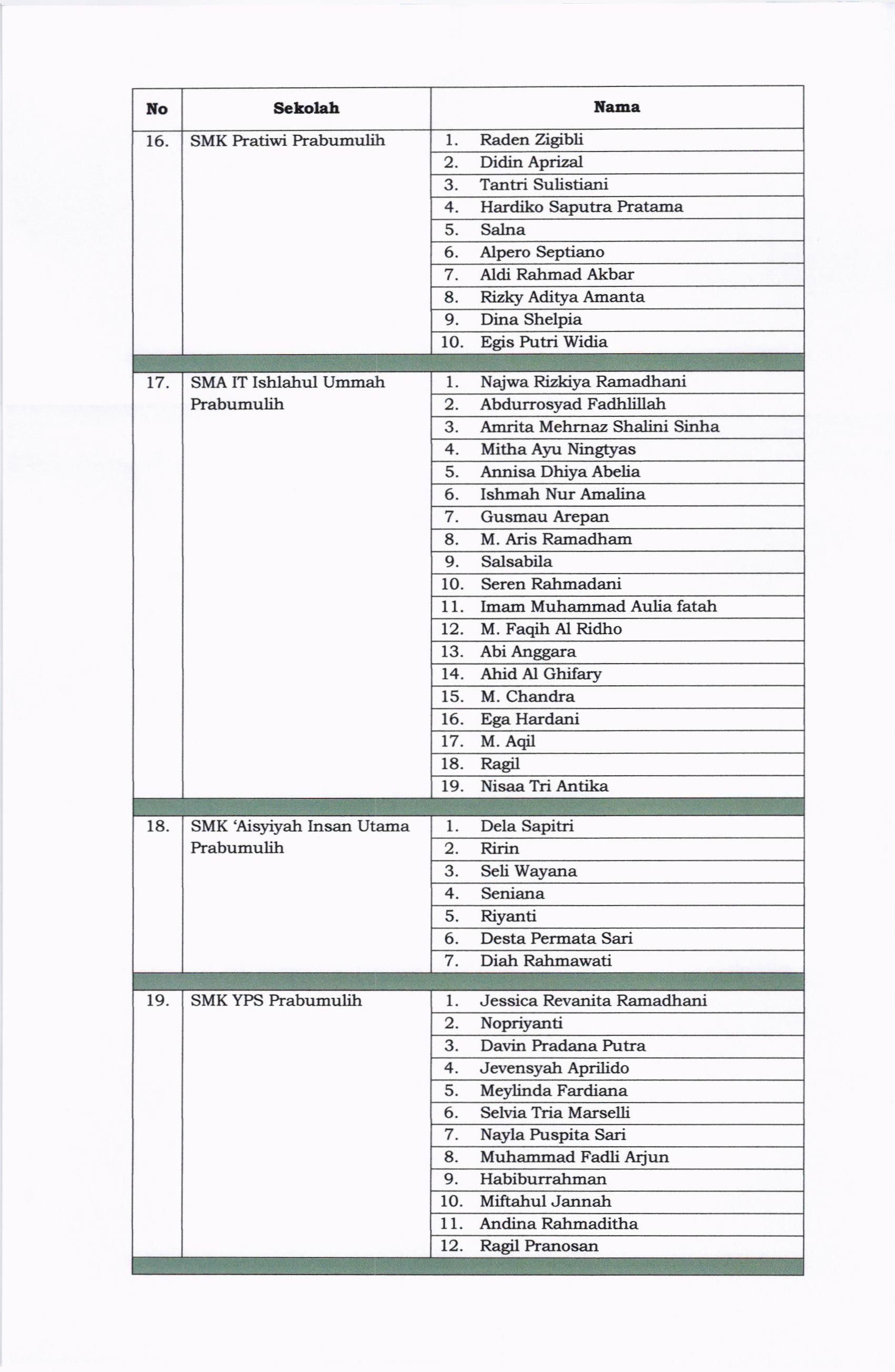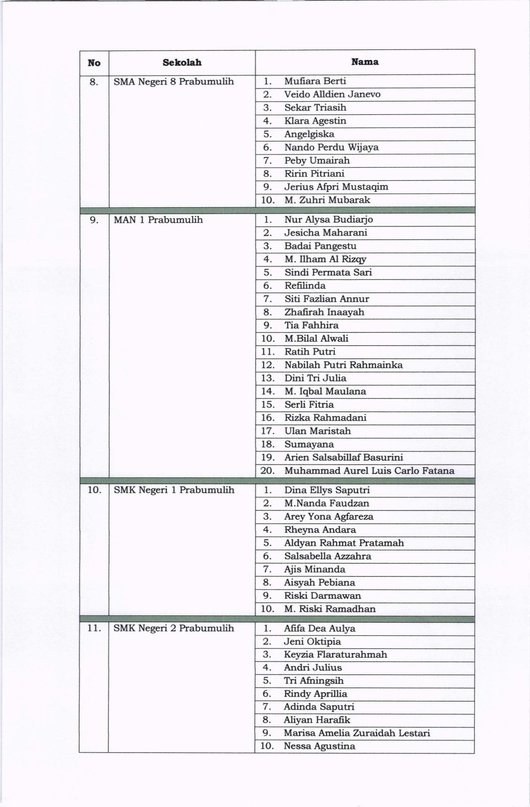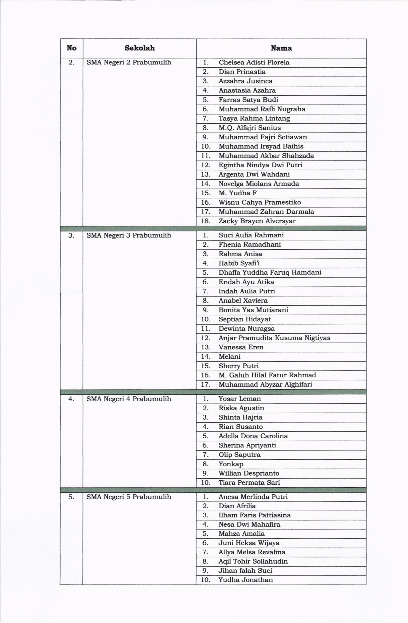 Berdasarkan Surat Keputusan Ketua KPU Kota Prabumulih Nomor 29/HK.03.1/1674/201 tentang Penetapan nama nama Siswa siswi SMA/MA/SMK yang Dinyatakan lulus dalam kegiatan Sekolah Demokrasi KPU Kota Prabumulih angkatan II Tahun 2021 untuk Kelas Pelajar. Bisa didownload disini