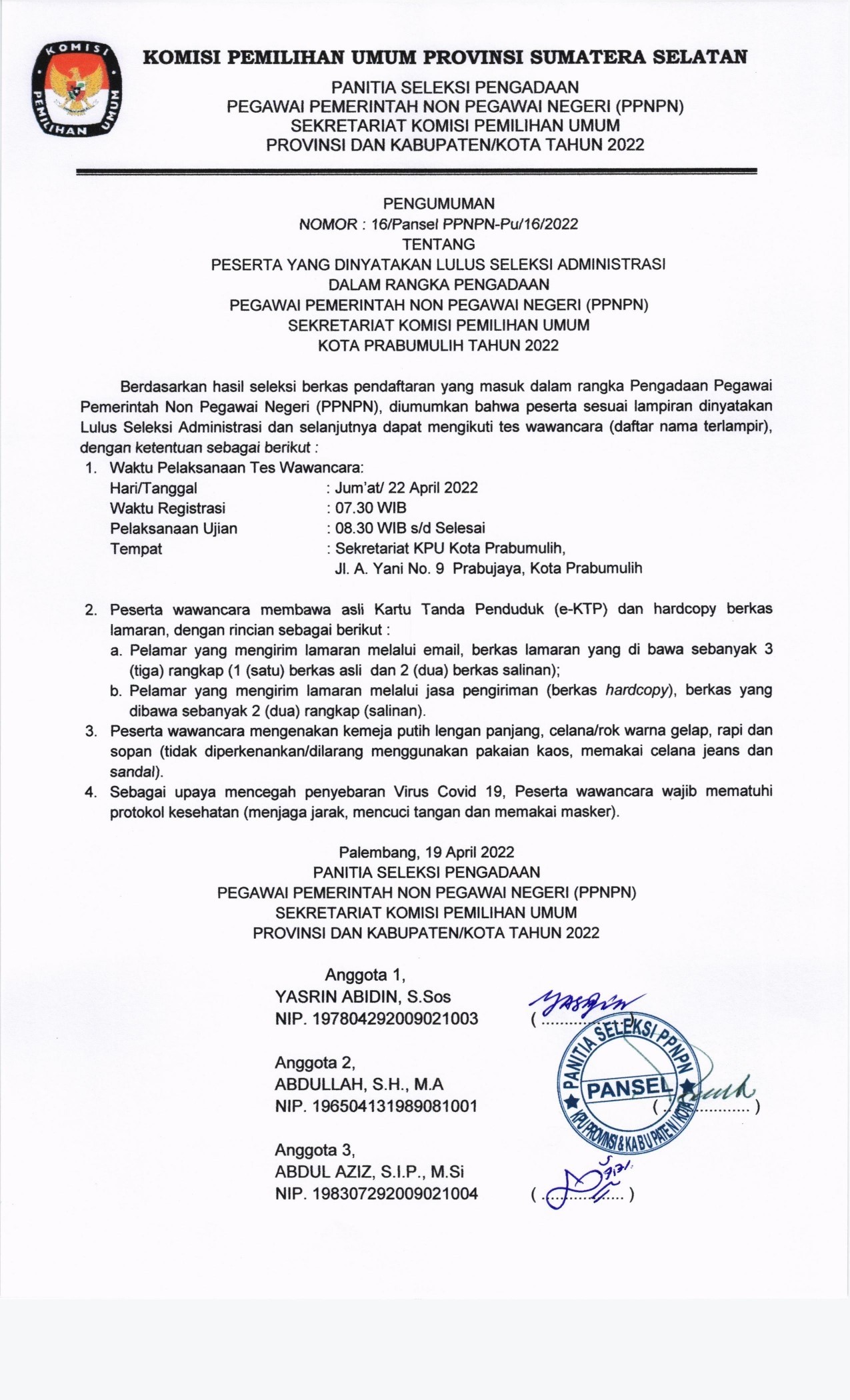 PESERTA YANG DINYATAKAN LULUS SELEKSI ADMINISTRASI PENGADAAN PEGAWAI PEMERINTAH NON PEGAWAI NEGERI (PPNPN) SEKRETARIAT KPU KOTA PRABUMULIH TAHUN 2022
