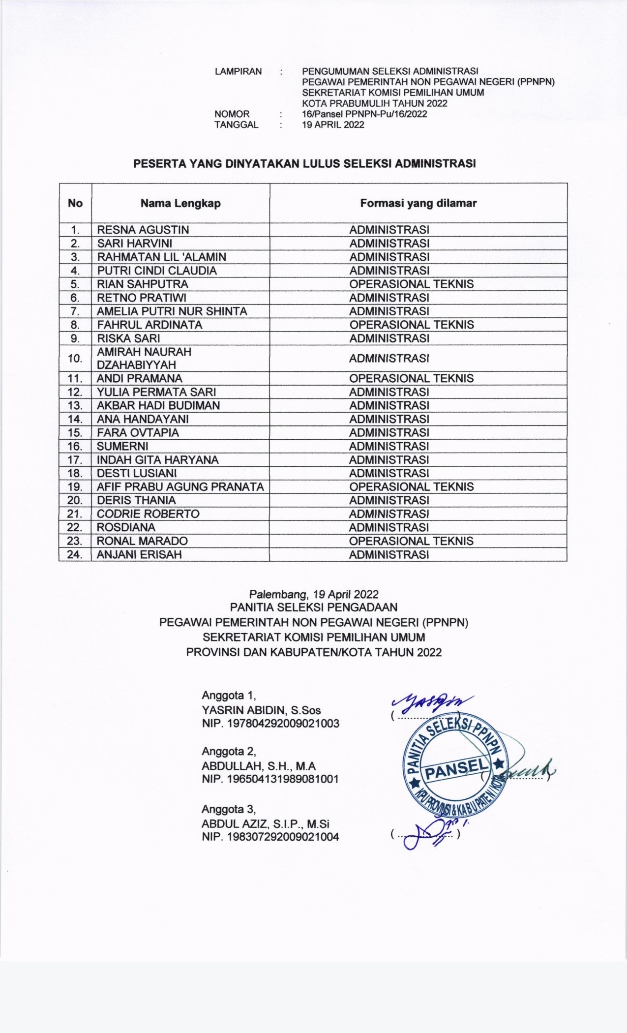 PESERTA YANG DINYATAKAN LULUS SELEKSI ADMINISTRASI DAI.AM RANGKA PENGADAAN PEGAWAI PEMERINTAH NON PEGAWAI NEGERI (PPNPN) SEKRETARIAT KOMIS! PEMILIHAN UMUM KOTA PRABUMULIH TAHUN 2022.