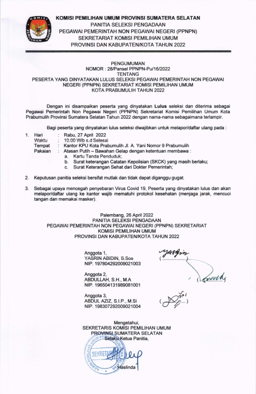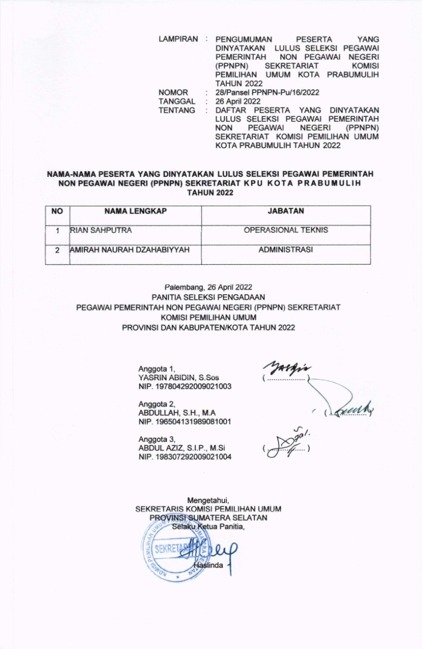 PESERTA YANG DINYATAKAN LULUS SELEKSI PEGAWAI PEMERINTAH NON PEGAWAI NEGERI (PPNPN) SEKRETARIAT KOMISI PEMILIHAN UMUM KOTA PRABUMULIH TAHUN 2022