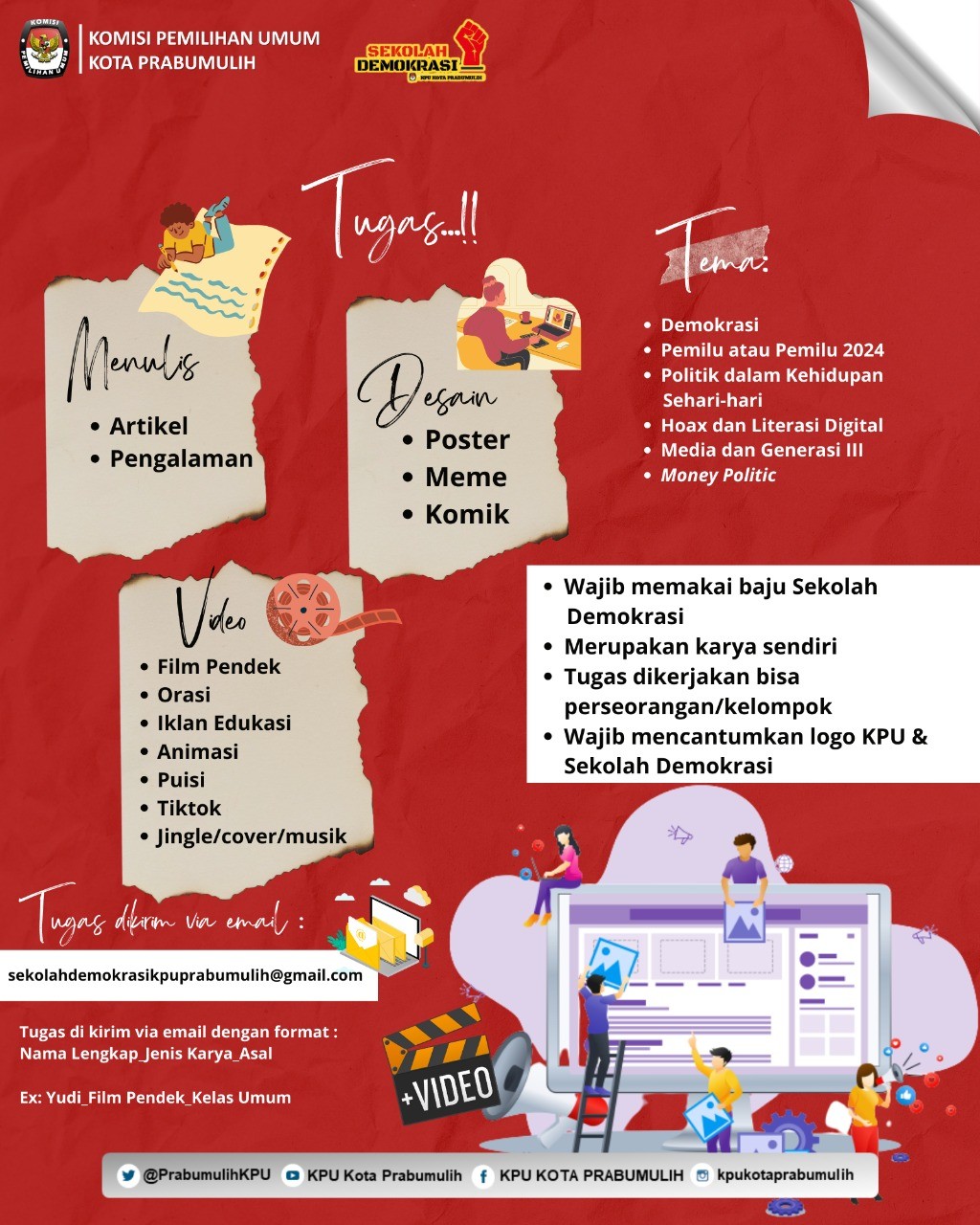 Setiap siswa sekolah Demokrasi harus punya Karya, untuk itu Tugas Sekolah Demokrasi Angkatan ke-2 ini dibagi dengan berbagai macam karya. Bisa Menulis (Artikel, Pengalaman), Desain (Poster, Komik, Meme) atau Membuat Konten/Video (film Pendek, Orasi,Iklan Edukasi, Puisi, Tiktok, Jingle,Cover). Setiap siswa dapat memilih salah satu dari bidang tertentu sesuai dengan minat dan bakat. Siswa sekolah demokrasi berkarya, berkarya untuk Indonesia.