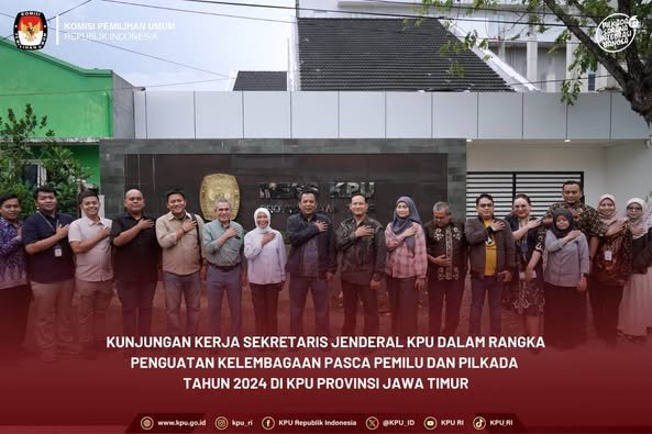 #Repost KPU Republik Indonesia #TemanPemilih, seluruh jajaran sekretariat harus tetap menjaga ritme pekerjaan. Kehadiran CPNS dan peningkatan status pegawai dari PPNPN ke PPPK harus disertai dengan pengenalan budaya kerja dan perubahan mental kerja. Oleh karena itu, diperlukan inovasi-inovasi internal dalam penguatan lembaga dan SDM. Hal ini disampaikan Sekretaris Jenderal KPU, Bernad Dermawan Sutrisno dalam kunjungan kerja penguatan kelembagaan pasca Pemilu dan Pilkada Tahun 2024 di Kantor KPU Provinsi Jawa Timur, Minggu, (6/7/2025). Dalam dialog dengan seluruh jajaran sekretariat, Bernad menegaskan pentingnya penyelesaian seluruh laporan pertanggungjawaban keuangan serta penataan Barang Milik Negara (BMN) sebagai prioritas kegiatan pasca pemilu dan pilkada. Pada kunjungan kerja ini, Bernad juga meninjau berbagai fasilitas kantor seperti ruang layanan PPID, ruang podcast, media center, ruang rapat komisioner, ruang kerja sekretariat, aula kantor, kantin serta mess KPU Provinsi Jawa Timur. Turut hadir dalam kunjungan kerja, Pejabat Eselon II, III, dan Tenaga Ahli pada Sekretariat Jendral KPU serta Sekretaris KPU Provinsi Jawa Timur beserta seluruh jajaran #KPUMelayani