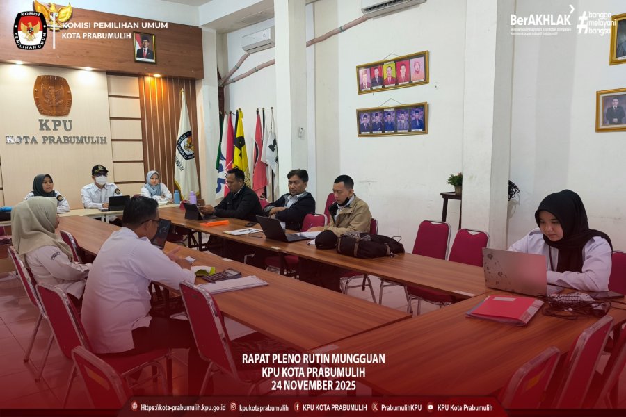 #Temanpemilih, Pada Hari Senin, Tanggal 24 November 2025 Pukul 09.00 WIB-Selesai. Bertempat Di Ruang Aula, Plt. Ketua, Anggota, Plt. Sekretaris, Kasubbag, dan Pejabat Fungsional KPU Kota Prabumulih. Melaksanakan Kegiatan Rapat Pleno Rutin Mingguan. Kegiatan ini bertujuan untuk melaporkan dan koordinasi mengenai kegiatan yang telah dan akan dilaksanakan oleh KPU Kota Prabumulih.