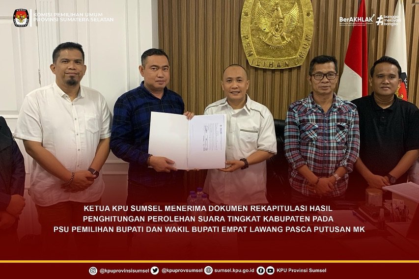 Repost KPU Republik Indonesia, penyelenggaraan Pilkada dan Pemungutan Suara Ulang (PSU) sudah terselenggara dengan sangat baik. Kesuksesan ini juga menjadi modal peningkatan proses demokratisasi. Hal ini disampaikan Anggota KPU Idham Holik saat menerima KPU Provinsi Banten yang mendampingi KPU Kab. Serang, KPU Provinsi Sumatera Selatan yang mendampingi KPU Kab. Empat Lawang, dan KIP Aceh saat mendampingi KIP Kota Lhokseumawe, untuk menyerahkan SK Penetapan Calon Terpilih Pilkada dan pasca PSU 2025, di Ruang Rapat KPU, Selasa (29/4/2025). Idham juga mengingatkan jajaran, pentingnya mendokumentasikan seluruh tahapan guna kepentingan evaluasi dan penulisan laporan. Untuk itu, semua diharapkan segera mempersiapkan laporan baik laporan tertulis pilkada maupun laporan PSU, termasuk juga laporan keuangan. Turut hadir jajaran Ketua dan Anggota KPU Provinsi Banten dan KPU Kab. Serang, KPU Provinsi Sumatera Selatan dan KPU Kab. Empat Lawang, KIP Aceh dan KIP Kota Lhokseumawe, beserta jajaran sekretariat, Kepala Biro Teknis Setjen KPU Melgia Carolina Van Harling, serta jajaran Sekretariat Jenderal KPU