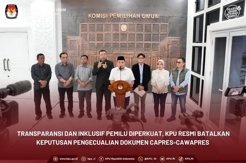 #Repost KPU Republik Indonesia #TemanPemilih, sejalan dengan komitmen KPU untuk menjunjung tinggi prinsip transparansi, terbuka, dan inklusif dalam tata kelola informasi—dalam rangka memberikan pelayanan informasi yang lebih luas serta menjamin akses masyarakat yang merata terhadap informasi publik—KPU secara kelembagaan memutuskan untuk membatalkan Keputusan KPU Nomor 731 Tahun 2025 tentang Penetapan Dokumen Persyaratan Pasangan Calon Presiden dan Calon Wakil Presiden sebagai Informasi Publik yang dikecualikan.