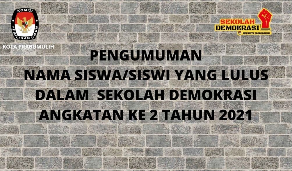Berdasarkan Surat Keputusan Ketua KPU Kota Prabumulih Nomor 29/HK.03.1/1674/201 tentang Penetapan nama nama Siswa siswi SMA/MA/SMK yang Dinyatakan lulus dalam kegiatan Sekolah Demokrasi KPU Kota Prabumulih angkatan II Tahun 2021 untuk Kelas Pelajar. Bisa didownload disini