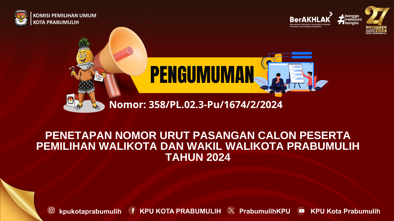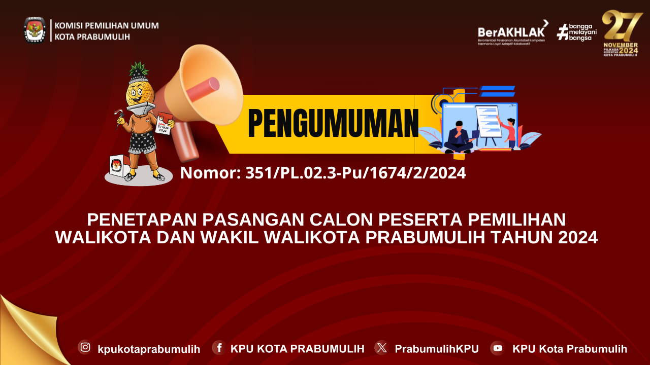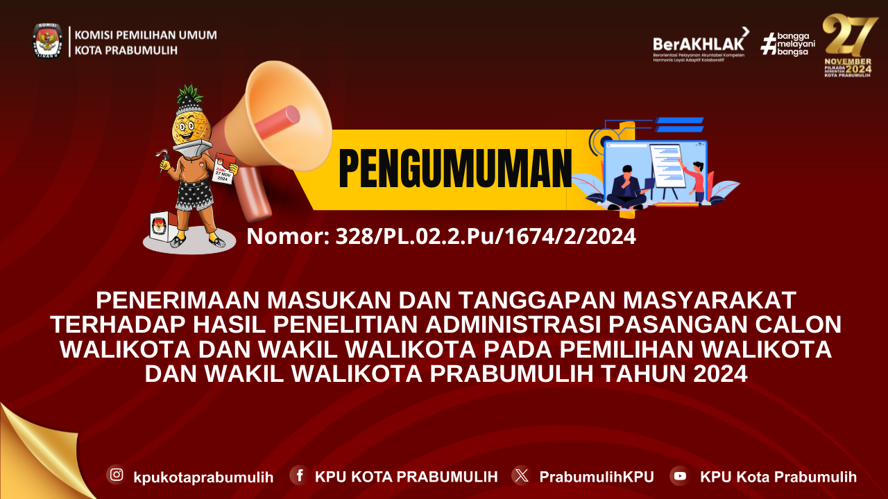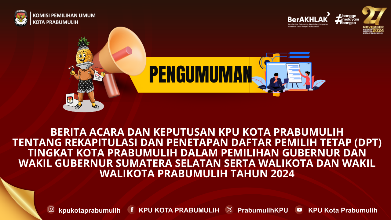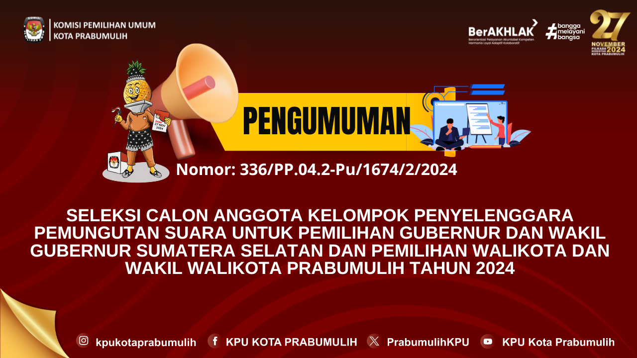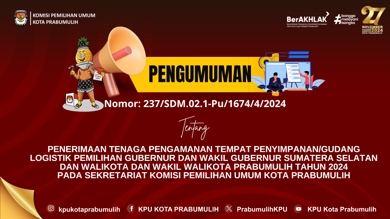 #TemanPemilih, Berikut kami sampaikan pengumuman Nomor: 237/SDM.02.1-Pu/1674/4/2024 tentang Penerimaan Tenaga Pengamanan Tempat Penyimpanan/Gudang Logistik Pemilihan Gubernur Dan Wakil Gubernur Sumatera Selatan Dan Walikota Dan Wakil Walikota Prabumulih Tahun 2024 Pada Sekretariat Komisi Pemilihan Umum Kota Prabumulih.