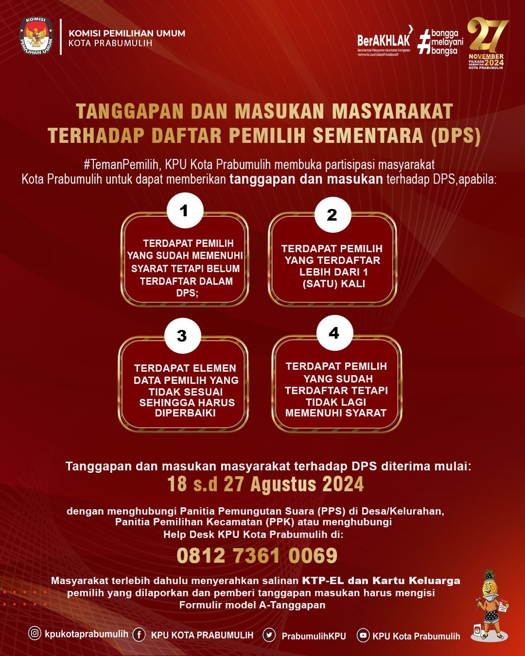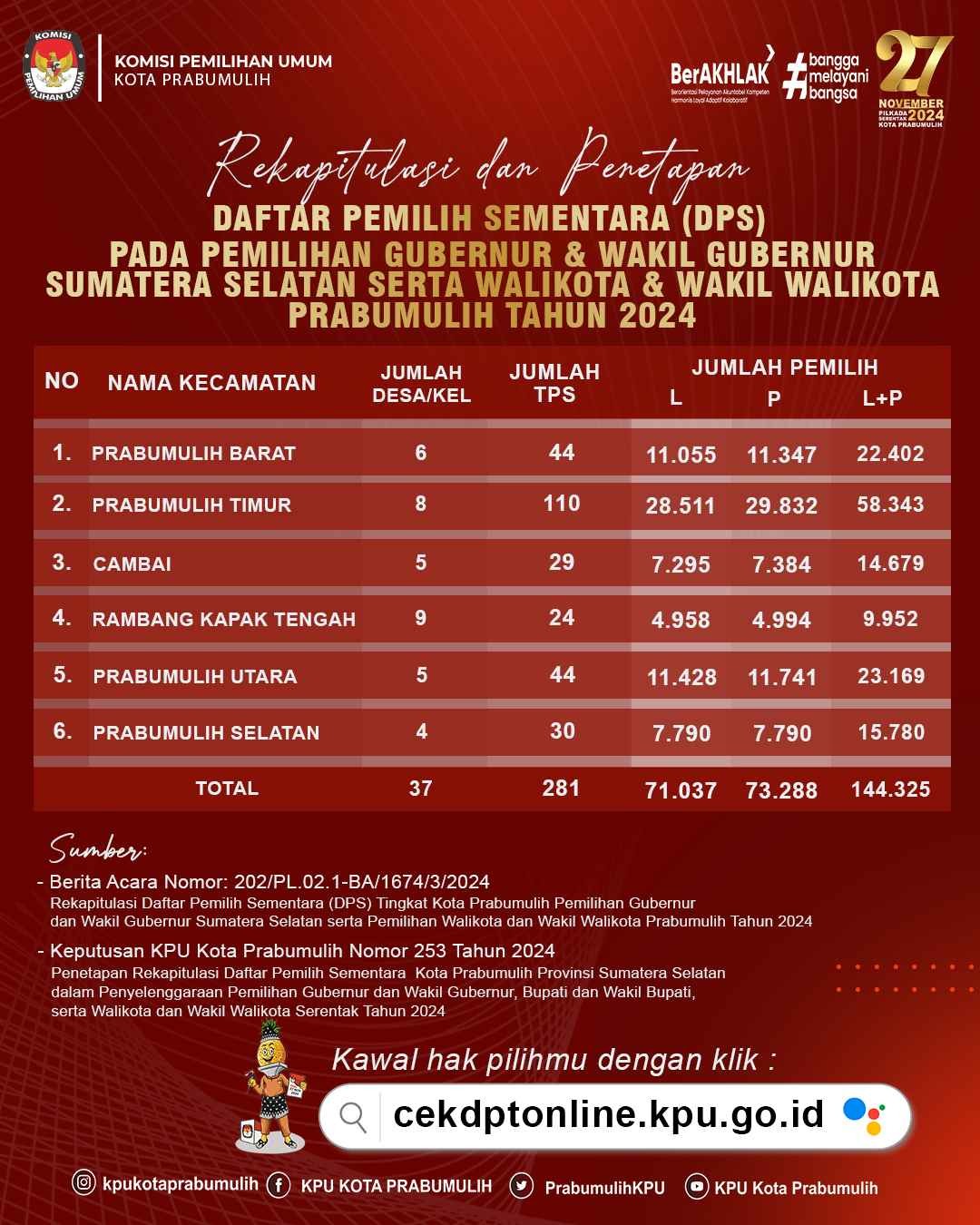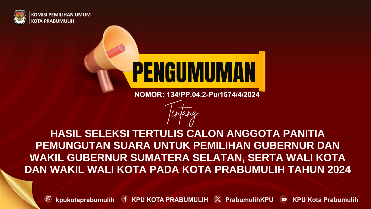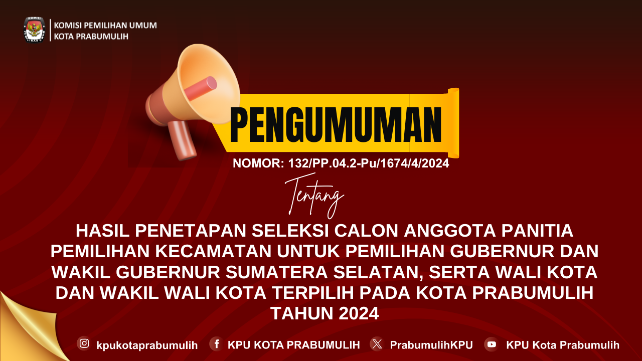 #TemanPemilih, Berikut kami sampaikan Pengumuman Hasil Penetapan Seleksi Calon Anggota Panitia Pemungutan Suara Untuk Pemilihan Gubernur dan Wakil Gubernur Sumatera Selatan, Serta Wali Kota dan Wakil Wali Kota Pada Kota Prabumulih Tahun 2024.