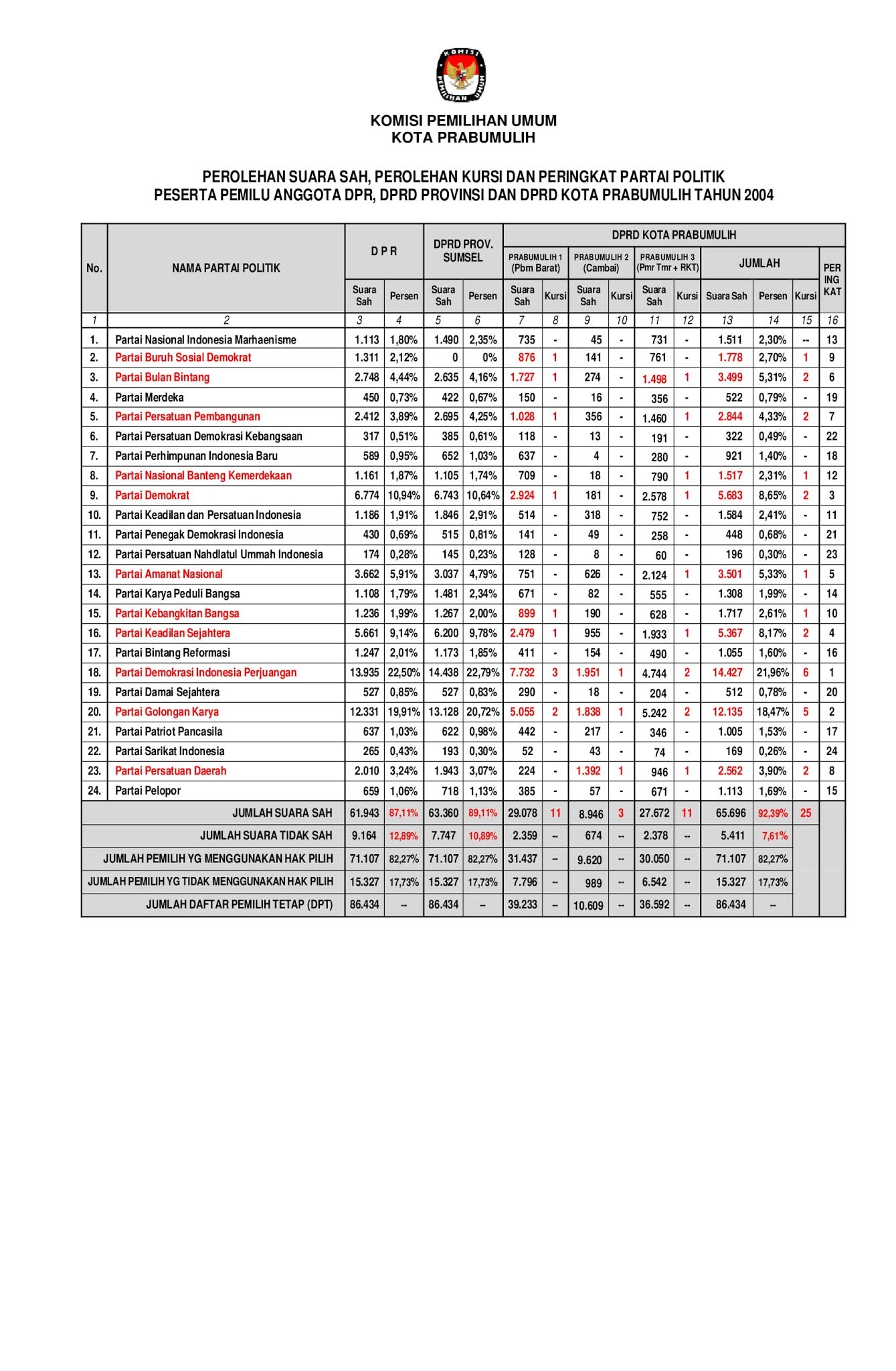 Perolehan Suara DPR RI, DPRD Propinsi Sumatera Selatan dan DPRD Kota Prabumulih Tahun 2004